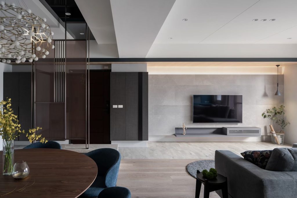 背板主牆以灰石紋長磚交丁,低調奢華風格搭配上漠藍迪色系的系統櫃,連同軟件的水晶燈飾,顛覆了以往泡茶空間,在感受上更加別緻。