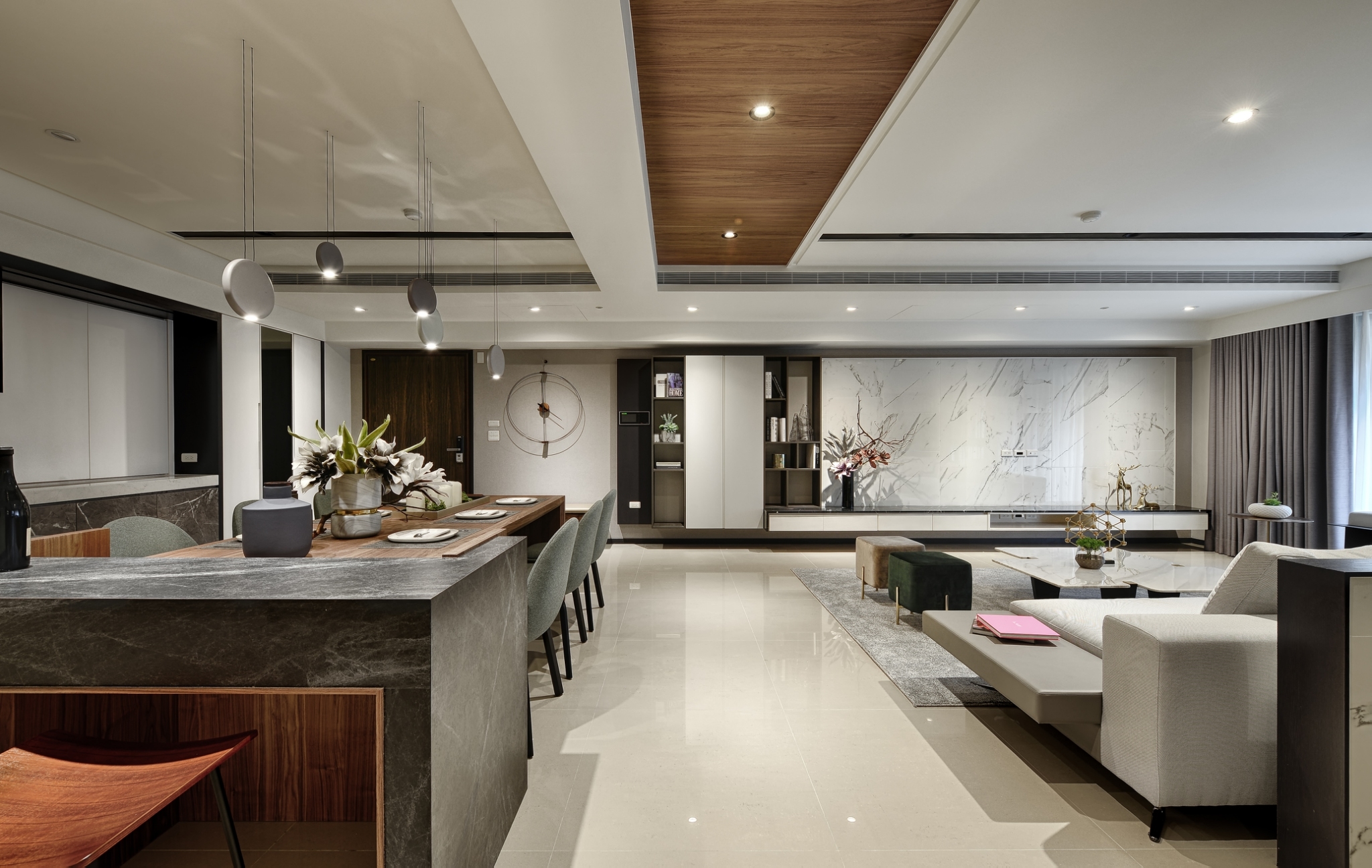 電視主牆銀狐細紋,直立交錯分割,讓整體空間達到放鬆
