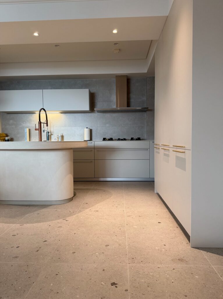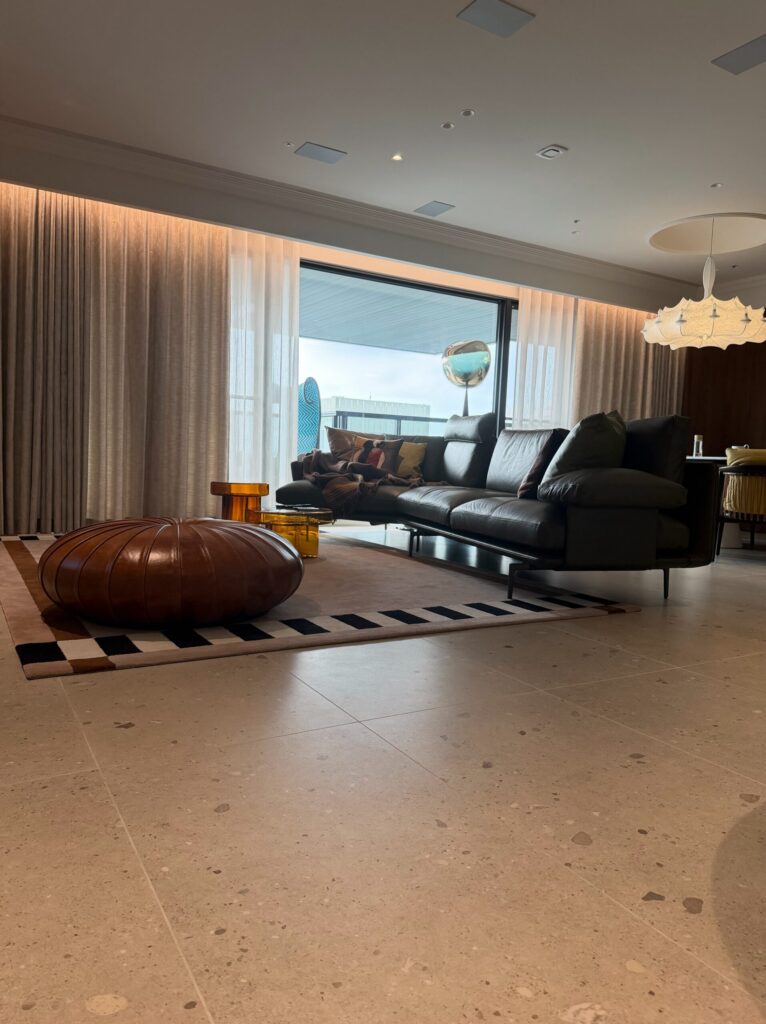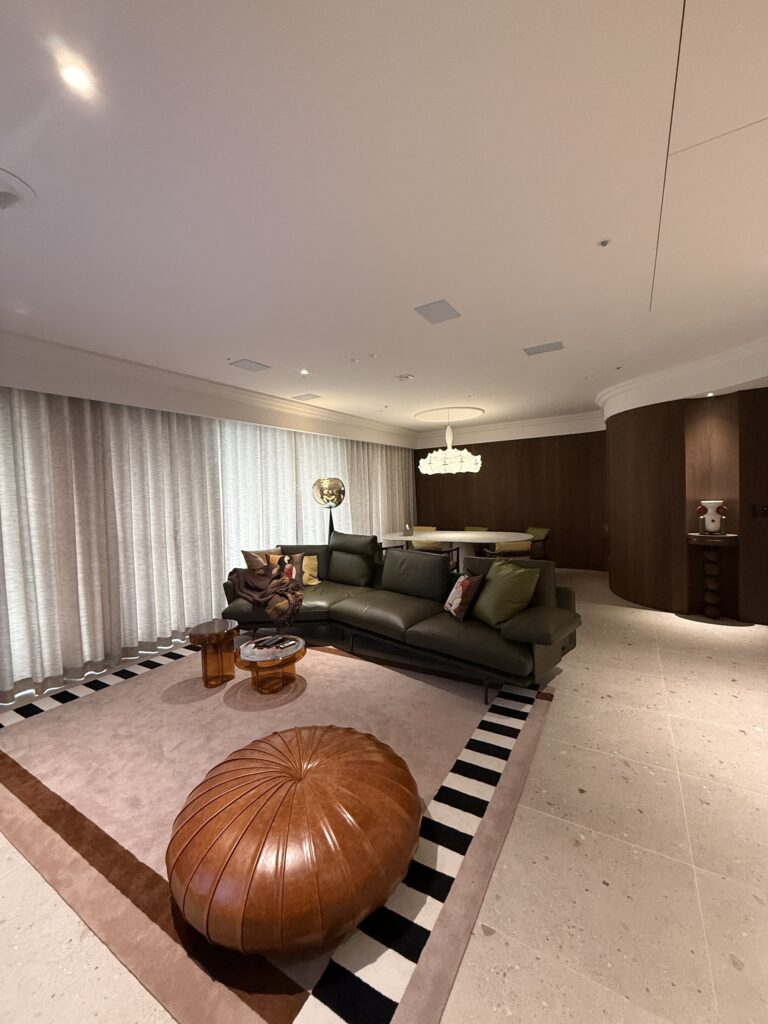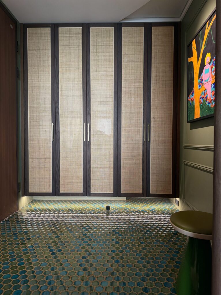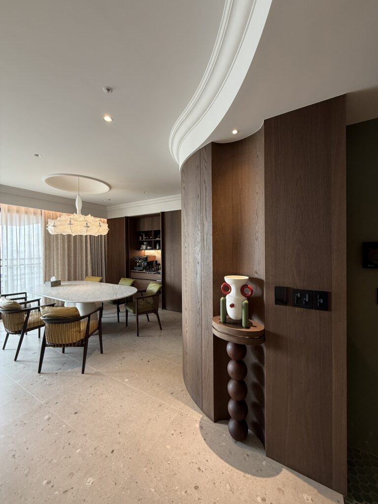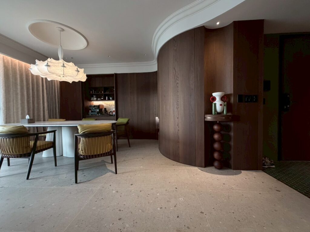 家的氣場往往由色系呈現,此案由藍綠窯變六角馬賽克將摩登的韻味投進視野,沿著弧形廊道入內,深胡桃木銜接著大面積義大利磨石磚,再以屋主的品味點綴上各式軟裝,將老派與奢華的氣場完美詮釋。