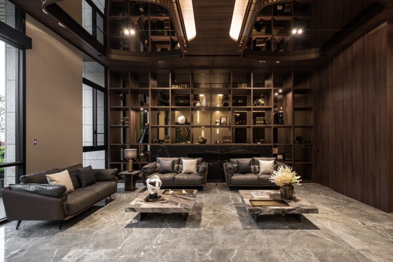 入門的木地磚給予了溫暖迎接,以洞石紋為…