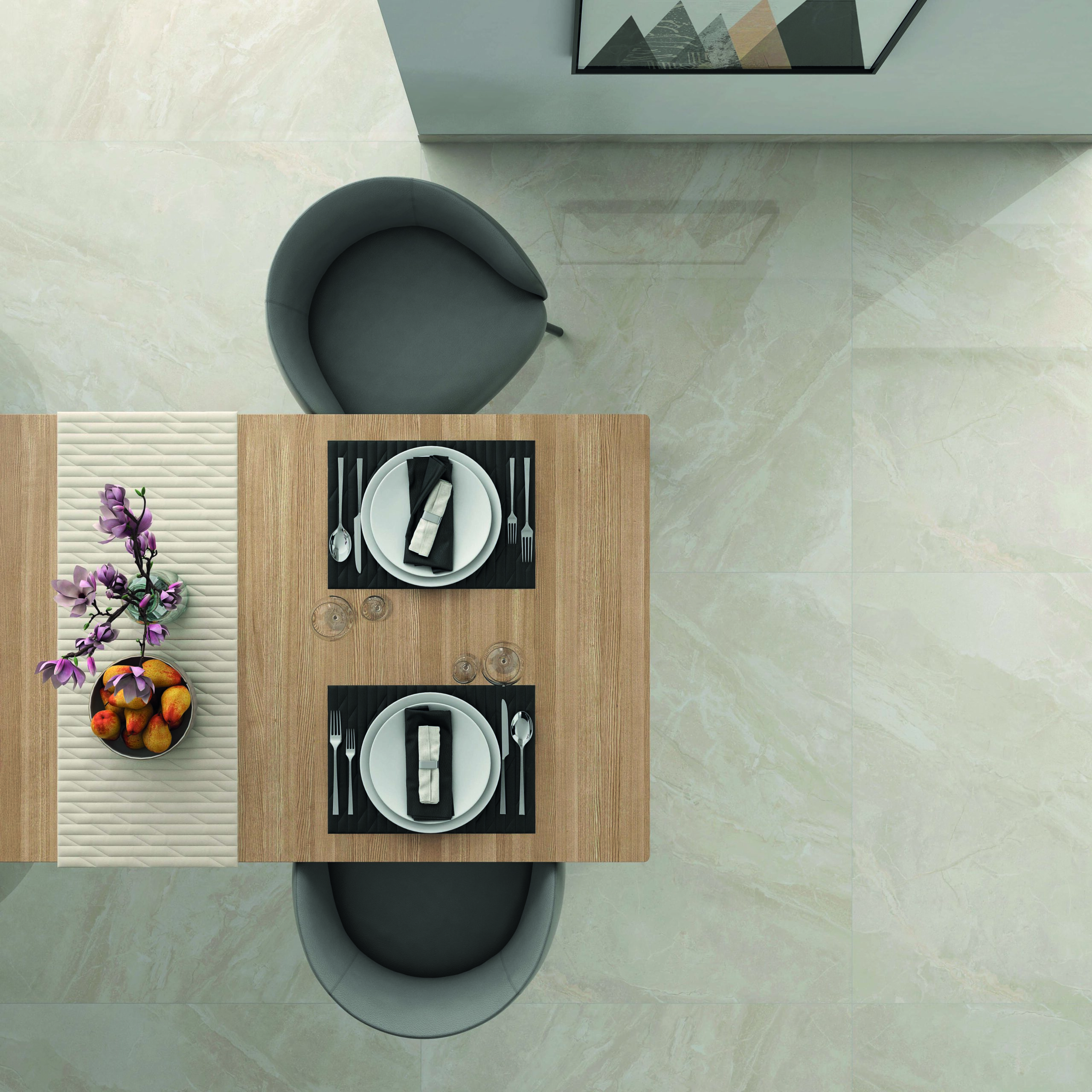 輕奢性石材紋理,搭配上大尺寸的鋪陳,在拋光面的延伸性上,讓空間充滿明亮度與視覺焦點。