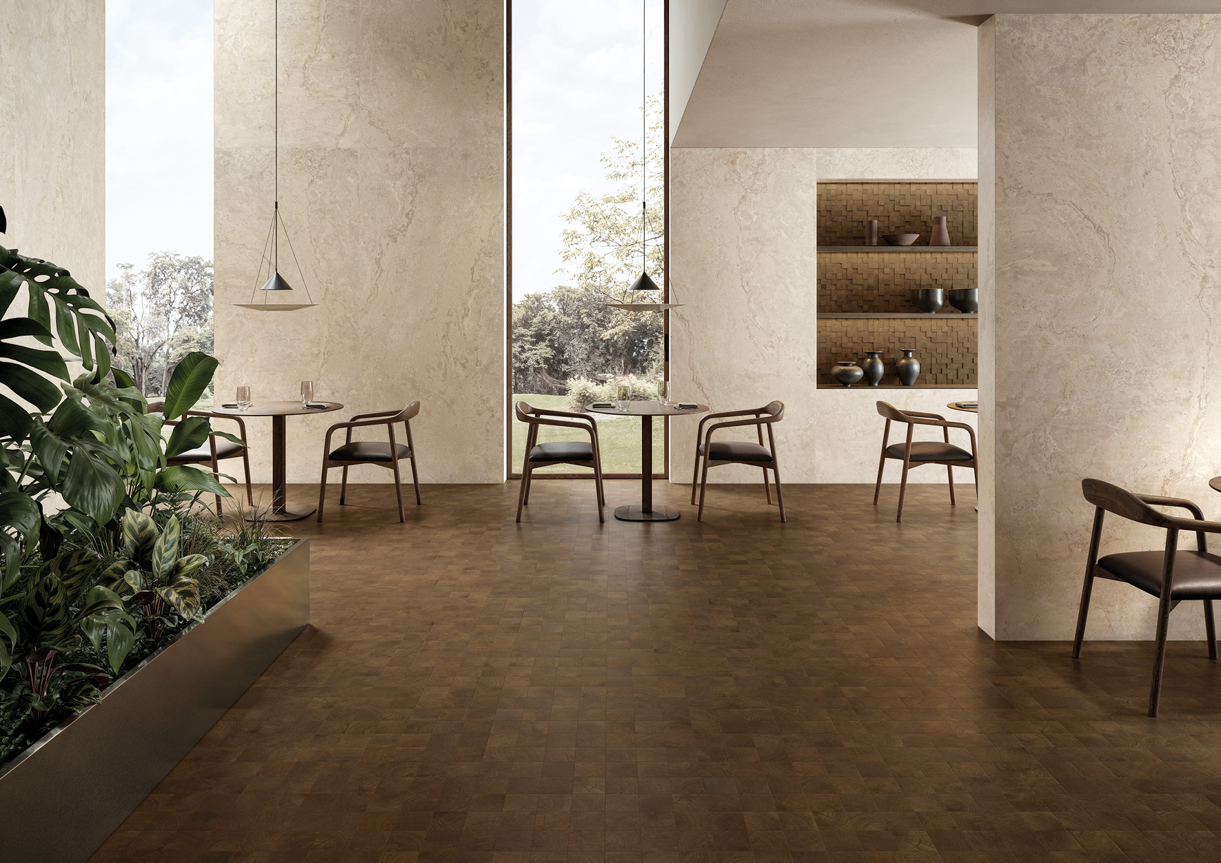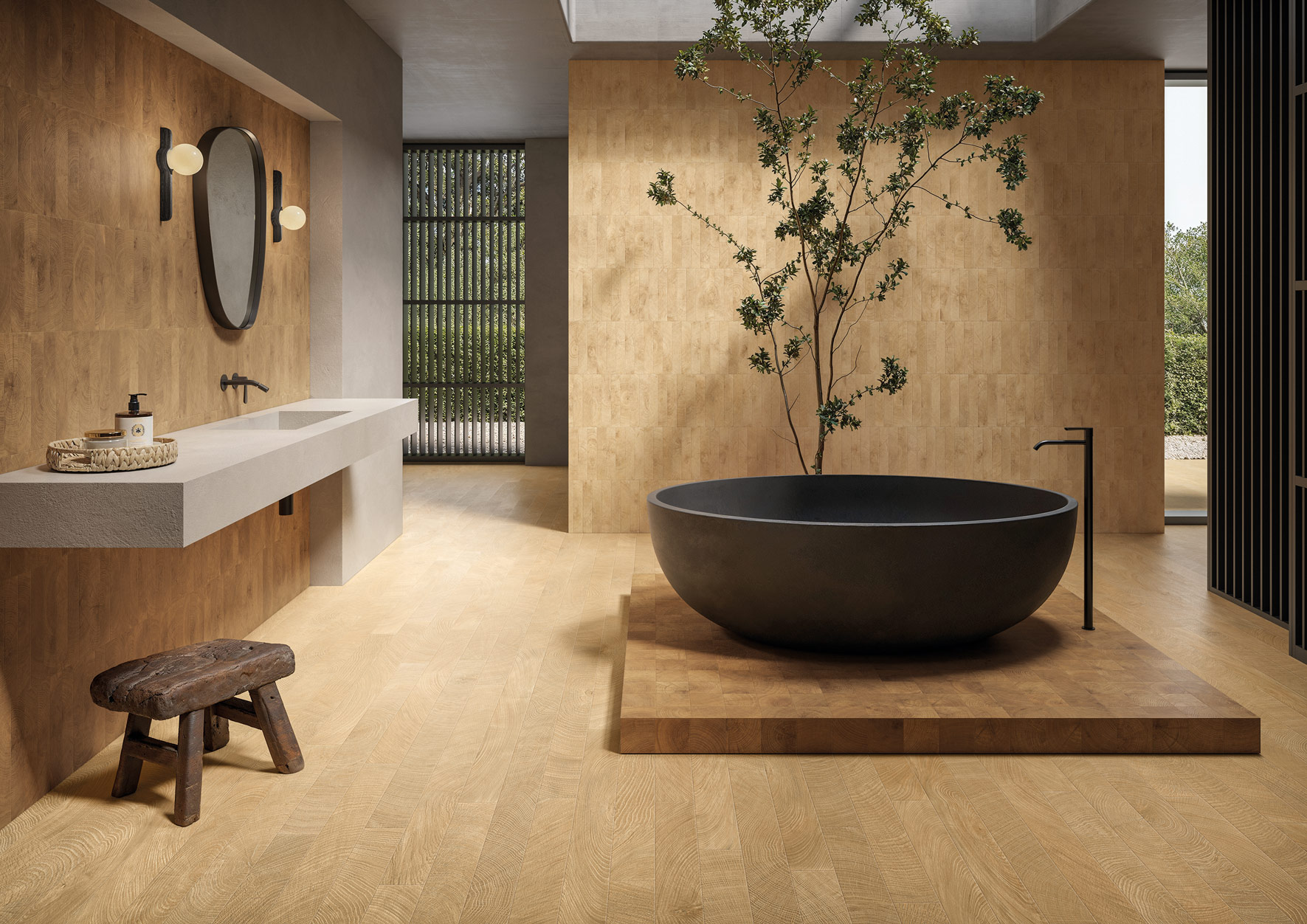 樹木獨有的紋理,由義大利工匠以永恆的造型雕琢而成。 「W-Circles」系列並非僅僅複製木材的質感,而是探索其年輪的更深層意義:象徵著永恆的生長,承載著記憶與意義的迷宮。該系列提供三種顏色可選,包括10×10厘米的尺寸、5.3×30厘米的磚塊、10×120厘米和20×120厘米的木板,以及帶有板條圖案的60×120厘米3D板條裝飾。產品採用兩種不同的木材組合而成,打造出層次豐富、結構精巧的複雜造型,比例與視覺流暢性完美平衡,渾然一體。最終呈現的材料將四季的循環融入風格細節,使每個空間都成為對時間和自然之美的致敬。該系列新增了 Mosaico 5×5 和 Mosaico 3D Cube,採用木紋三維瓷磚,為空間帶來額外的動態。